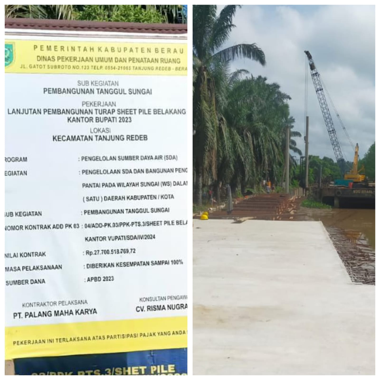 Tanjung Redeb,Berau – Kegiatan Pembangunan Tanggul Sungai penurapan (Sheet Pile) belakang kantor Bupati Berau TA 2023, senilai Rp27,7miliar pada Dinas PUPR melalui bidang Sumber Daya Air (SDA) Kabupaten Berau, masih menyisakan pertanyaan terkait persoalan addendum yang di anggap sudah melampaui batas waktu dalam kesepakatan kerja tertulis yang terpasang di area lokasi pekerjaan.